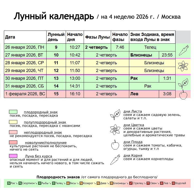 Неделя для работы с растениями не плохая, есть время развернуться, тем более, что прошлую неделю я таки проигнорила. Для черенкования отлично подойдут дни Тельца, в Близнецах работа с ампельными растениями, Рак вообще второй по плодородности знак Зодиака. Луна растущая, можно сеять всё, кроме корнеплодов. Но я с посевами ещё погожу, а вот с фиалками уже надо заниматься, чтобы до весны успели окрепнуть. Но самым первым таки надо посадить/пересадить гиппеаструм. Совсем пора, уже начинает луковица скукоживаться без полива. • 27.01.2026 20:58 - 27.01.2026 23:55 • 29.01.2026 22:56 - 30.01.2026 01:31 • 01.02.2026 00:51 - 01.02.2026 03:09 У растений, посеянных (посаженных) при Луне в Тельце, формируется большой урожай, плоды дольше хранятся, однако на семенные цели он (урожай) не годится (семена плохо хранятся и имеют низкую всхожесть). Посеянные в этом знаке растения долго не всходят, зато всходы очень дружные. У них много побегов, обильное, продолжительное и красивое цветение, крепкая корне