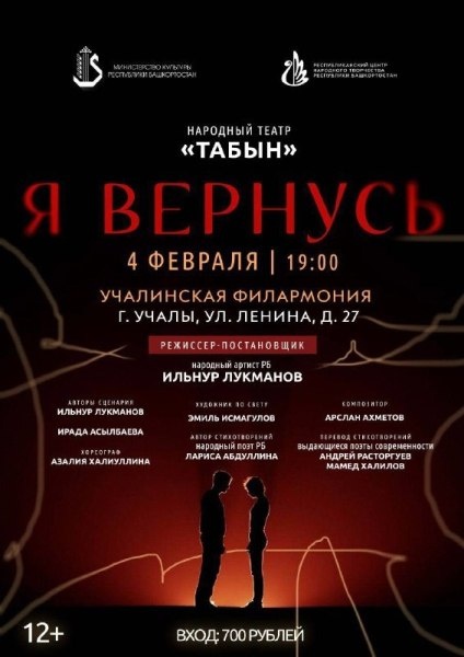+) Коллектив народного творчества «Табын» приглашает Вас погрузиться в историю мужества и чести на премьере спектакля «Я вернусь». ____________________ История повествует о молодых ребятах из Учалинского района, чьи сердца полны любви к родине и готовности отдать жизнь за неё. Это рассказ о дружбе, преданности и силе человеческого духа. Именно здесь родились герои, готовые встать на защиту родной земли. Главные роли исполнят талантливые актёры, каждый из которых вложит душу в создание образа настоящего защитника Отечества. Этот спектакль вдохновляет на любовь к родине, уважение к старшим и веру в лучшее будущее. ____________________ Режиссер-постановщик народный артист РБ Ильнур Лукманов ____________________ Нач. 19:00 Билеты в продаже в кассе Учалинской филармонии, цена 700 р. Касса работает в будние дни с 10:00 до 19:00, перерыв13:00-14:00 Справки по 8 347 912 06 24 Источник https://uchaly102.ru/?p=121765