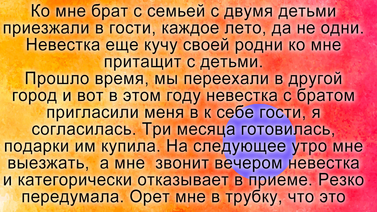 Прошло время, мы переехали в другой город и вот в этом году они пригласили меня в гости, я согласилась. Три месяца готовилась, подарки им купила. На следующее утро мне выезжать, я сама за рулем, еду одна, звонит вечером невестка и категорически отказывает в приеме ,придумала.