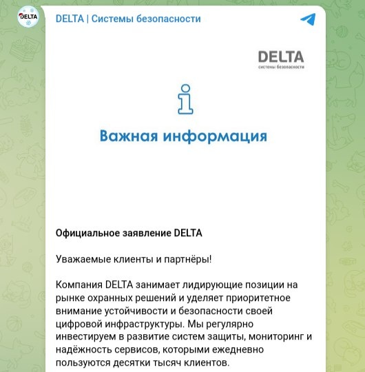 ⚡ Оператор охранных систем Delta заявил о масштабной кибератаке свои IT-системы