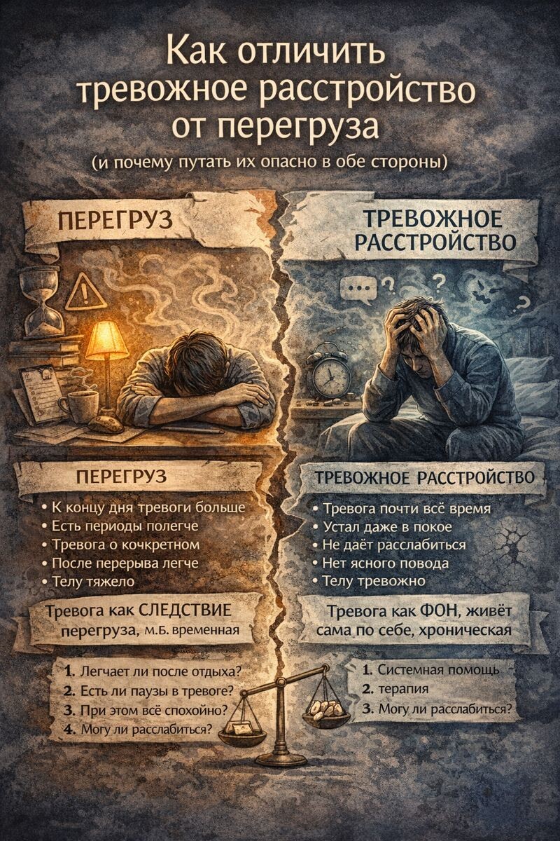 (и почему путать их опасно в обе стороны) Начнём с главного: и перегруз, и тревожное расстройство - реальные состояния, ни одно из них не "надуманное". но они разные по механизму, а значит и требуют разного подхода. Перегруз - это когда система работает слишком долго без восстановления, а тревожное расстройство - когда система сбилась и тревога живёт сама по себе. Теперь разберём подробнее. При перегрузе тревога появляется потому что ты долго был в напряжении, много ответственности, мало отдыха, нет ощущения "конца", тело не успевает восстанавливаться - тревога усиливается к концу дня или недели,