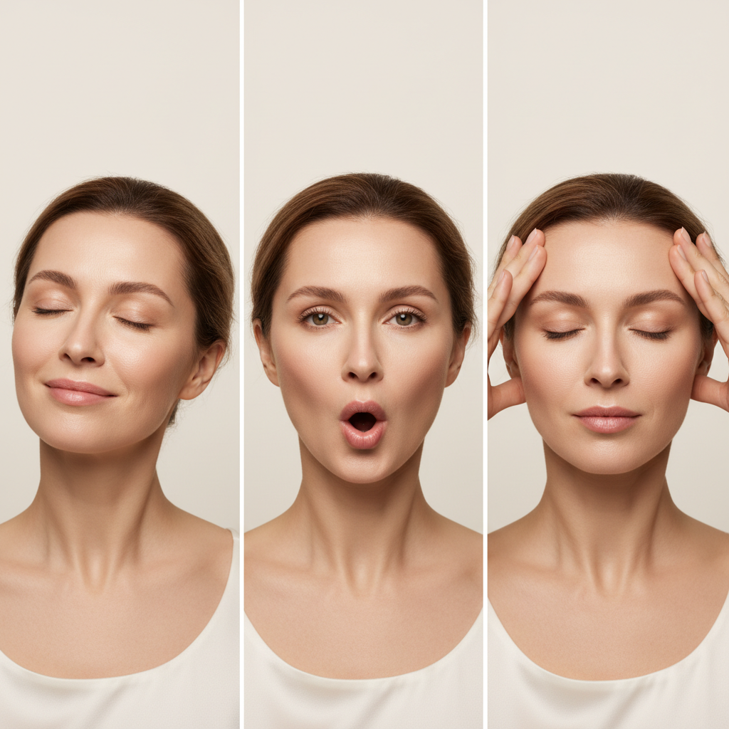 * Повторите 8-10 раз. Вы сразу почувствуете, как напрягается зона под челюстью. 3. Лифтинг висков и языка