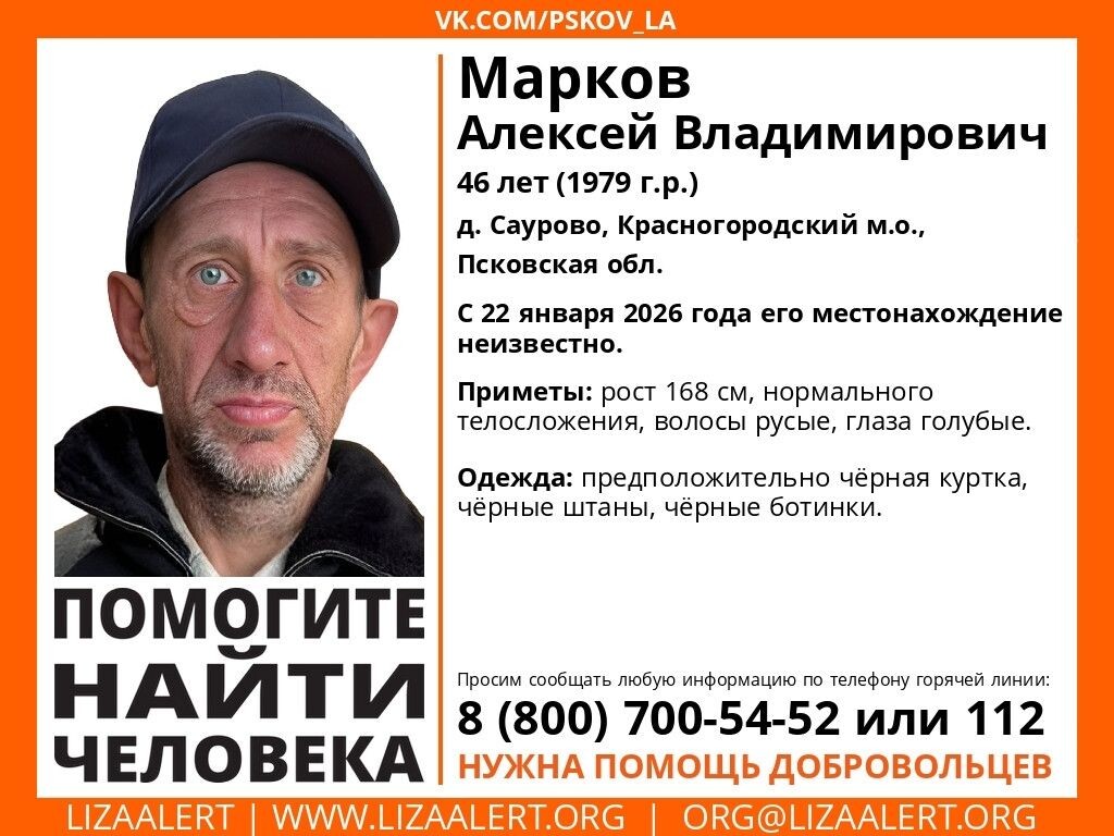 🚨 Поисковый отряд «ЛизаАлерт» Псковской области разыскивает пропавшего 46-летнего Алексея Владимировича. 📍 Он проживает в деревне Красногородского муниципального образования, его местонахождение неизвестно с 22 января 2026 года. 📞 Информацию можно сообщить инфоргу отряда Анастасии (позывной «Подсолнух») по телефону +7 (911) 353-84-97. 👉ВЛуки.ру