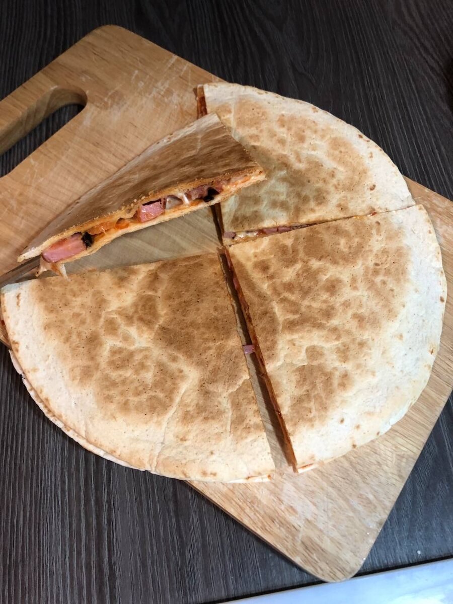 Приготовили вкусную кесадилью на лаваше с сосисками, помидором 🍅 , сыром 🧀 и соусом 🤤