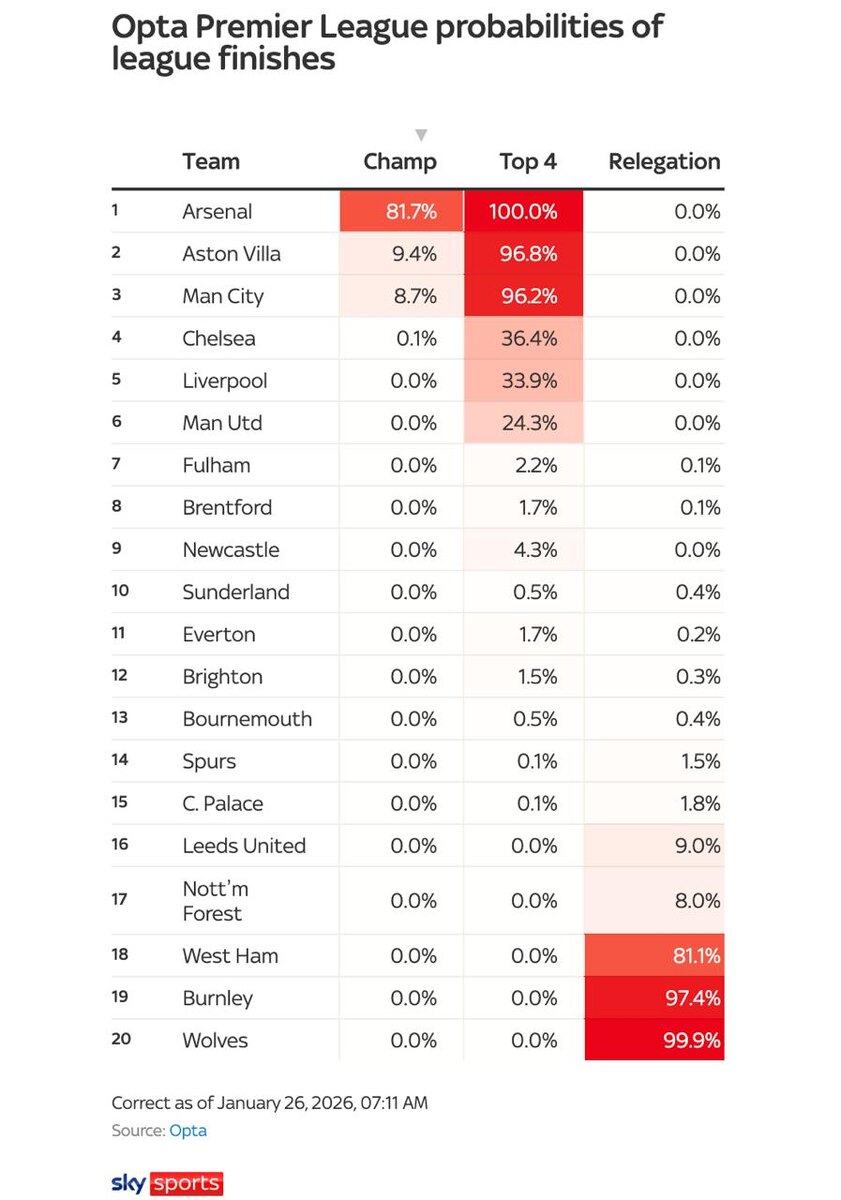 В Opta оценили вероятность чемпионства, попадания в топ-4 и вылета для каждой из команд Премьер-Лиги 📊