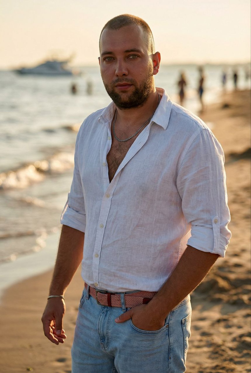 : 😀Заходим в этот бот или в этот 😀Выбираем "нейросети" 😀Нажимаем "Nano Banana" 😀Нажимаем "Nano Banana Pro" 😀Прикрепляем через скрепку свое фото и выбранный промпт 😀Наслаждаемся результатом😍 8K коммерческая fashion editorial, вертикальный средний план, соотношение сторон 2:3. Чёткие черты лица, резкая фокусировка на лице и ключицах, неглубокая глубина резкости (85mm, f/2.2). Поза: корпус слегка развернут к камере, одна рука в кармане джинсов, другая расслаблена у бедра, рубашка незастёгнута на пару пуговиц, подчёркивая грудную клетку и цепочку на шее — брутально и сексуально. Одежда: лёгкая белая льняная рубашка, рукава подкатаны до предплечий, светло-голубые джинсы, рыжевато‑бежевый плетёный ремень, тонкий металлический браслет. Фон: песчаный пляж на золотом часе, лёгкий прибой и мягкий боке волн, на горизонте размытые силуэты людей и скалы/яхта — натуральный атмосференый антураж. Свет: тёплый золотой боковой свет, контрастные тени, натуральная глянцевая ретушь, драматичная и э