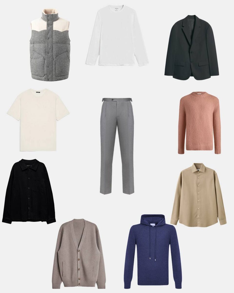 Показываю на примере одних брюк, с каким верхом их сочетать. Для универсальных образов — на работу, прогулку, мероприятие — нам понадобятся лишь одни брюки, тоже базовые. К примеру, серого оттенка, умеренно свободного кроя, можно без стрелок (или с ними, но чтобы их можно было разгладить), обязательно средней посадки (низкая — неудобная, высокая — подойдёт не всем мужчинам), лучше без шлевок для ремня, с поясом на резинке или боковыми регуляторами. В качестве примера таких брюк возьму за основу брюки моего бренда Gavayou. Логика такая: • свободный крой — универсальный, вписывается и в бизнес-кэжуал, и в повседневный, и в расслабленный стиль; • серый цвет — сочетается с абсолютно любыми оттенками наравне с чёрным и белым (тройка цветов-ахроматов); • тот же свободный крой подходит всем мужчинам — высоким и невысоким, худощавым, полноватым и атлетичным, в общем, универсальная модель для всех.