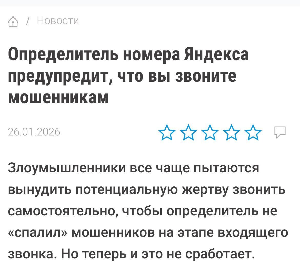 вы сами пытаетесь набрать аферистам. Это защита от схем с СМС и сообщениями в мессенджерах, где людей уговаривают позвонить в «службу поддержки». По данным Яндекса, 67% разговоров с мошенниками начинались как раз по инициативе пользователей. Нейронки анализируют активность номера, жалобы и другие признаки. Если контакт опасный, на экране появится яркое предупреждение — и вы успеете сбросить вызов до того, как вам ответят. Функция уже работает в приложении Яндекс с Алисой AI и мобильном Яндекс Браузере. Пользуемся и не ведемся на уловки. CtrlAltDelights- подписаться