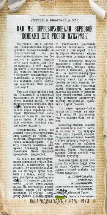 Источник: Ленинское знамя. -1961.- 16 августа Персоналии: Александр Павлович Каменских В отделении «Сельхозтехника» нам рассказали, что зерновой комбайн переоборудовали в силосоуборочный. Это сразу привлекло наше внимание, особенно учитывая, что в колхозе всего одна машина для уборки кукурузы, а посевы этой культуры занимают более 250 гектаров. Мы отправились в Острожку, чтобы внимательно изучить переустройство комбайна и выявить возможные недостатки. Один из них — расположение приспособления для измельчения растений. Лопасти вентилятора второй очистки и стан первой очистки были убраны, а звездочки малого транспортера оставили прежними. Ворохотранспортер получил вращение с правой стороны, при этом цепь, приводящая его в движение, была удлинена. За ворохотранспортером установлен наклонный транспортер, по которому масса движется в левую сторону по ходу машины. Поперек молотилки установлен малый транспортер, получающий вращение от вентилятора второй очистки. Слева по ходу машины смонтиров