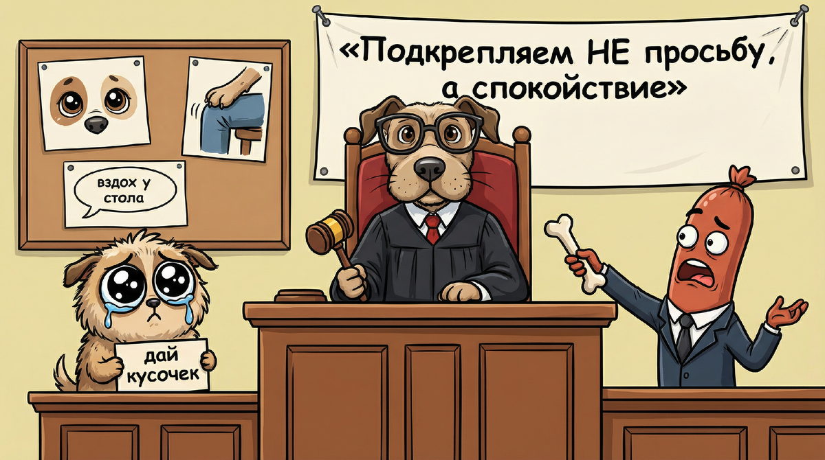 Обожаю в этом случае цитировать Татьяну Шаманову: "Ваша собака попрошайничает у стола? Прекрасно, радуйтесь! У нее хорошая пищевая мотивация!" А раз у собаки хорошая пищевая мотивация, значит ее можно научить, чему угодно, в том числе верному поведению на кухне, когда хозяева обедают за столом. Хуже, когда собака не проявляет интереса к еде. Тогда этот интерес нужно целенаправленно развивать. Мои собаки могут посмотреть на меня весьма красноречиво, когда я сажусь за стол или беру в руки что-то вкусное. Я вижу этот интерес и предложение поделиться. Но не более того. Я могу попросить своих собак пойти и полежать на месте, пока я ем, и это не приведет к спорам, конфликтам и пререканиям. Если же твоя собака, не получив от тебя кусочек, начинает вести себя непотребным образом: навязываться, залезать на колени и в тарелку, скулить, лаять, толкать и царапать лапами, заливать пол слюной и т.д., есть повод задуматься и поработать. Так формулируют вопрос многие. Не надо отучать. Надо научить т