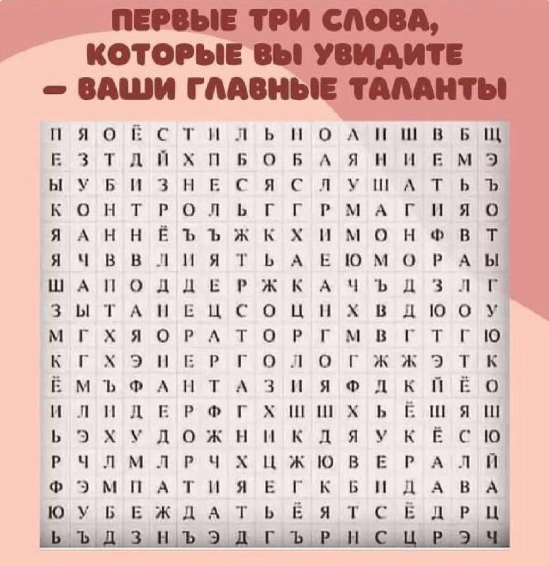🔠🔠🔠🔠 Посмотрите на картинку и первые три слова, которые вы увидите будут о ваших талантах 🤩 ✍️Делитесь в комментариях, что увидели. Согласны с тестом? #тест #самопознание