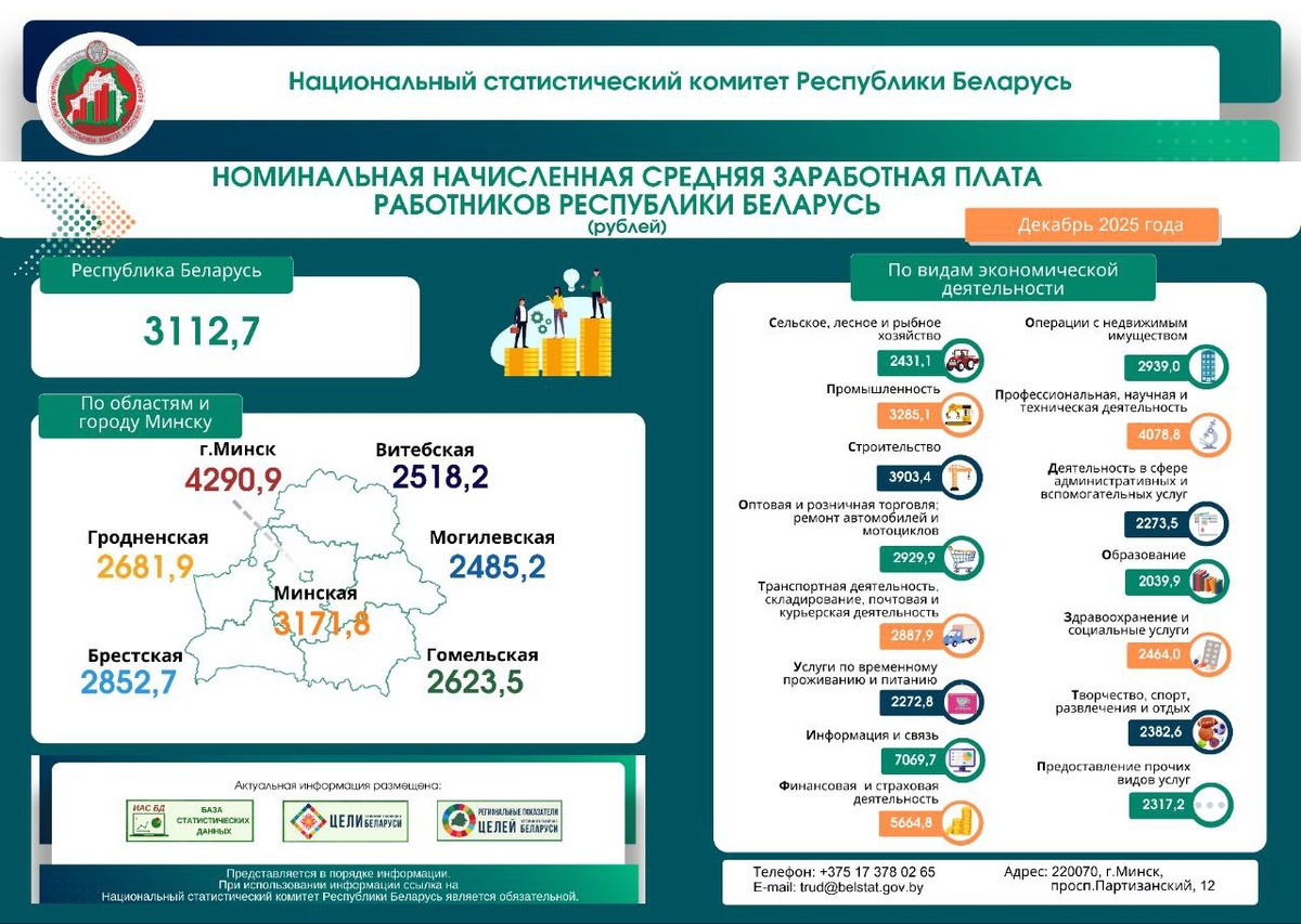 🔄Белстат: номинальная начисленная средняя заработная плата работников Республики Беларусь в декабре 2025 г. составила 3112,7 рубля.