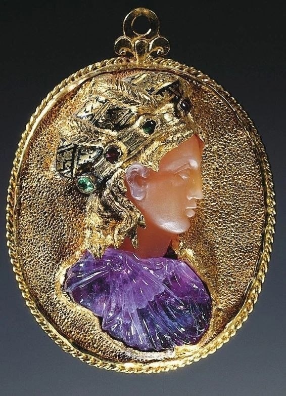 Подвеска Commesso, датируемая 1550-1560 годами, представляет собой не только произведение искусства, но и символ богатства и утонченности своего времени. В настоящее время она хранится в королевской коллекции, некогда принадлежавшей королеве Каролине, супруге Георга II. Это уникальное украшение выполнено в технике коммессо, где фрагменты камеи соединяются с золотыми элементами. Подвеска изображает женский бюст в низком рельефе, созданный из разнообразных драгоценных материалов и камней: сердолик, золото, аметист, бирманский рубин, гранат, русский гранат и колумбийский изумруд. Считается, что техника коммессо возникла во французской мастерской при дворе Генриха II, где использовались фрагменты итальянских камей XVI века. Подобные произведения искусства служили не только украшениями, но и статусными символами: "Коммессо — это не просто техника; это способ запечатлеть дух времени, когда каждое украшение было пропитано историей" Терра инкогнита | Неизвестная земля