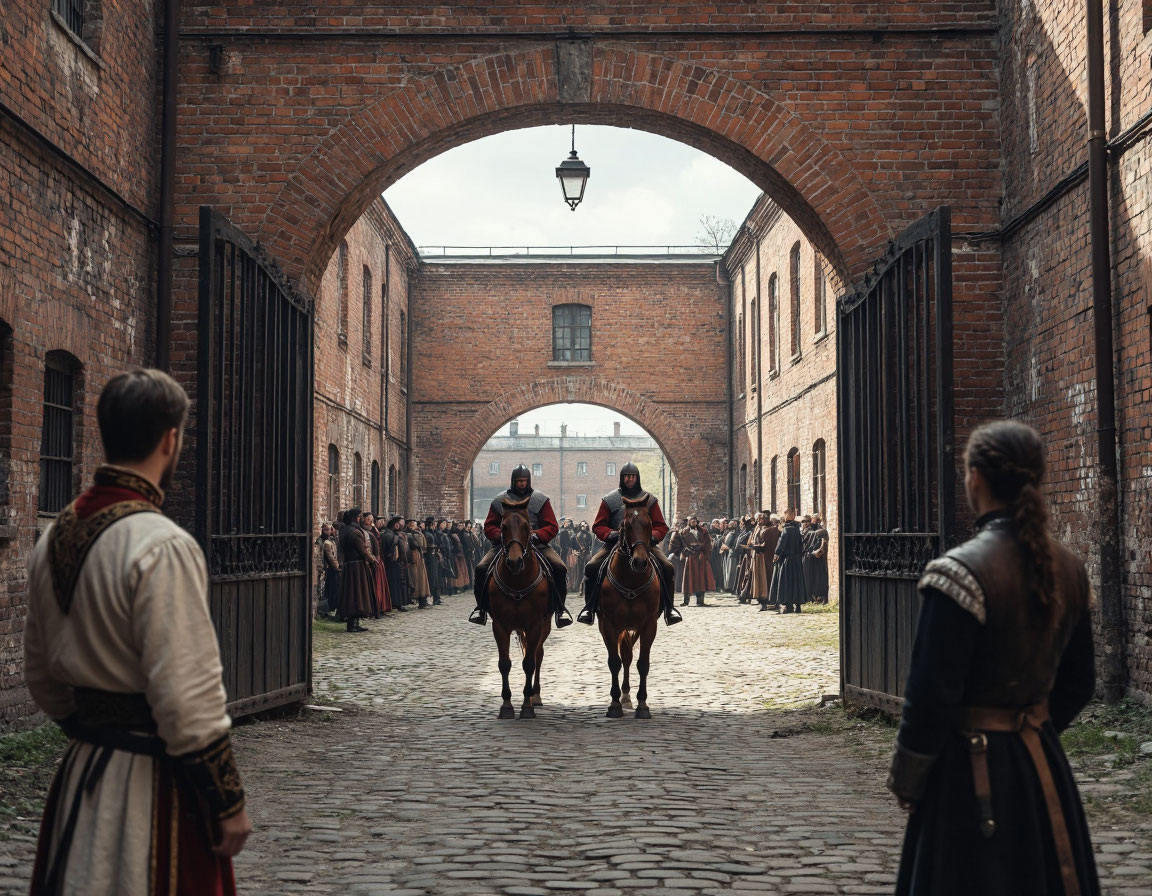 Между тяжелых расписных створ появился первый конь, за ним второй. Потом мимо ошеломленных подруг прошествовал целый табун гнедых и вороных красавцев, которых вели под уздцы люди, одетые в узнаваемом специфическом стиле Воеводства.