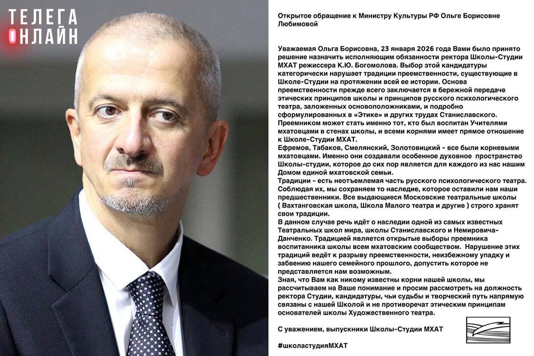 К главе Минкульта обратились выпускники Школы-студии МХАТ с просьбой отменить назначение Константина Богомолова и.о. ректора, так как это противоречит традиции выбирать преемника актерским сообществом из числа «корневых мхатовцев» — выпускников школы. А еще говорят, что начальство не выбирают. 🚲 Подпишись на Телега Online