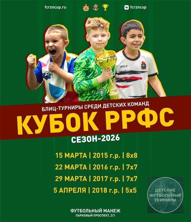 ! 💙Мы рады Вам сообщить о нашем новом проекте на весну 2026 года и приглашаем Ваши команды со всей России принять участие в Блиц-турнирах на Кубок РРФС❗ 📍Блиц-турниры будут проходить: ⛳ Крытый Футбольный манеж - Рязань, Парковый проспект, 2/1 Все форматы проведения в соответствии с стандартами РФС на 2026 год ❗ 📜Даты проведения: 🏆15.03 - 2015 г.р - формат 8х8 🏆22.03 - 2016 г.р - формат 7х7 🏆29.03 - 2017 г.р - формат 7х7 🏆05.04 - 2018 г.р - формат 5х5 ⛳Игровая площадка 9х9, 8х8,7х7 - 54х40м 5х5 - 40х20м ⚽ Игровой мяч - 4 🥅Игровые ворота 9х9, 8х8,7х7 - 5*2 5х5 - 3*2 ⏱Игровое время - 9х9, 8х8, 7х7 - 1 тайм по 25 минут, 5х5 - 1 тайм по 20 минут 📕📘📙Схема плей-офф зависит от количества поданных заявок! 📸📹🖥Фото, видео, трансляции, интервью на всех блиц-турнирах❗ 📗Положение https://disk.yandex.ru/i/IZWnzGeLgRqa-A 📓Скачать форму заявки: 5х5 - https://disk.yandex.ru/i/pJt8CetuLsytVQ 7х7 - 2017 - https://disk.yandex.ru/i/H7krLnSUmfKVXw 7х7 - 2016 - https://disk.yandex.