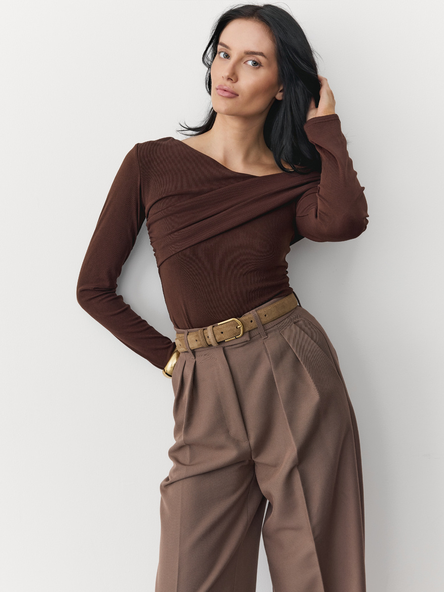 Боди с открытым плечом Vashbrend - с бесплатной доставкой и примеркой. С наступлением холодов у нас включается режим выживания. Гардероб превращается в набор брони: свитера с высоким горлом, термобелье, плотные колготки. Мысль оголить хотя бы сантиметр кожи кажется безумием. Но в 2026 году мода стала рациональной. Мы больше не гуляем часами по морозу, мы перемещаемся перебежками между теплыми точками. Именно поэтому боди с открытым плечом стало не ошибкой, а признаком статуса и понимания своего комфорта. Нас с детства пугали: не ходи раздетой, заболеешь. Но вирусы не появляются от холодного воздуха на плече. Мы мерзнем, когда нарушен теплообмен всего тела. Боди с асимметричным вырезом — это самый хитрый предмет зимнего гардероба. Носить открытые вещи зимой — это невербальный сигнал о вашем образе жизни. Человек, который час ждет автобус на остановке в минус двадцать, так не оденется. Открытое плечо говорит окружающим: я не мерзну. Моя жизнь комфортна. Я перемещаюсь на машине или такси,