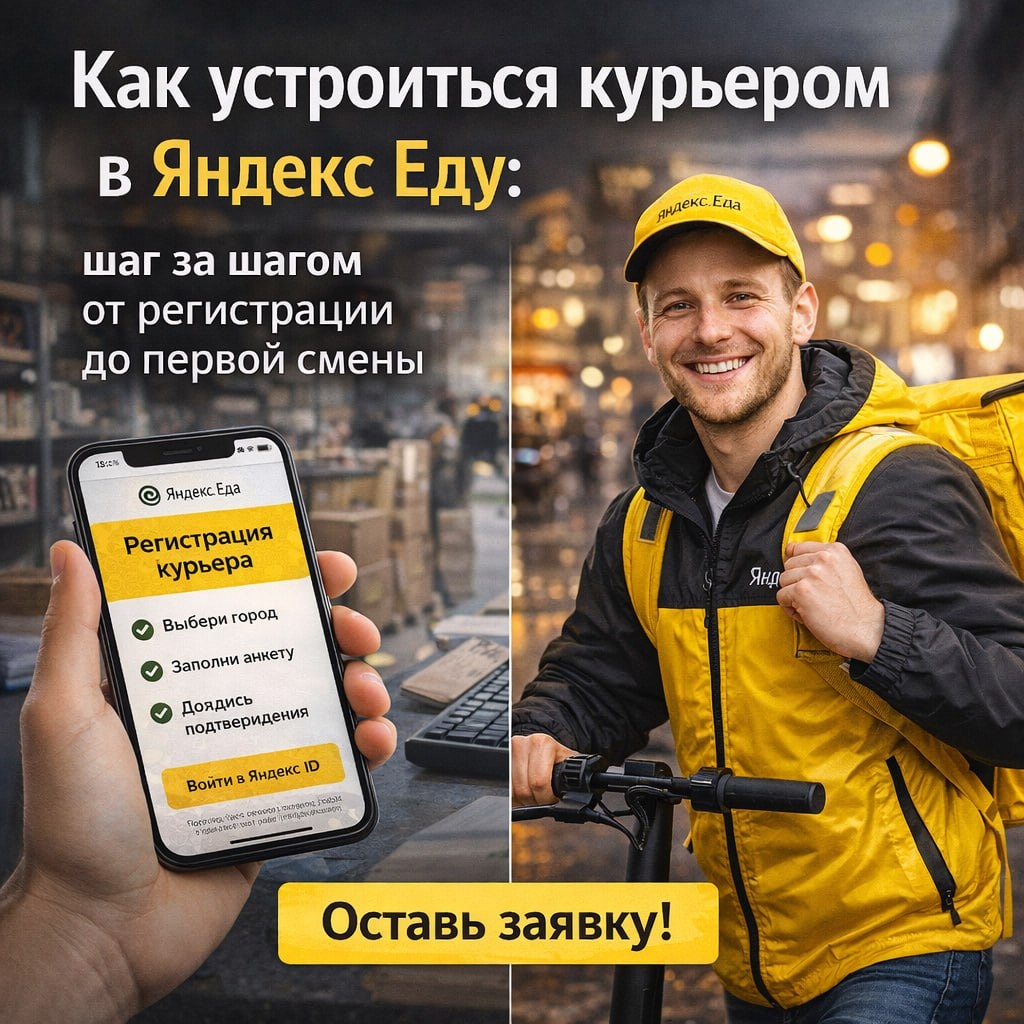 Многие хотят попробовать работу курьером в Яндекс Еде, но останавливаются на этапе регистрации: непонятно, какие документы нужны, как включить смену и где взять первый заказ. На самом деле путь от “увидел вакансию курьера Яндекс Еда” до “получил первый заработок 1 800–2 500 ₽ за смену” состоит из нескольких простых шагов. Чтобы начать работу курьером, тебе понадобится паспорт РФ или другой документ в соответствии с требованиями сервиса, телефон с интернетом и установленным приложением курьера и, при необходимости, велосипед, самокат или автомобиль. Для пешего курьера достаточно удобной обуви и одежды по погоде. Главное — желание работать и зарабатывать от 1 800–3 500 ₽ за смену и выше, в зависимости от города и формата работы. Первый шаг — оставить заявку на работу курьером в Яндекс Еде. Сделать это можно по ссылке за 5–10 минут → https://clck.ru/3RUBMQ Регистрация курьера в Яндекс Еде проходит быстро и понятно. Сначала нужно перейти по ссылке [ССЫЛКА] и выбрать город, в котором хоче
