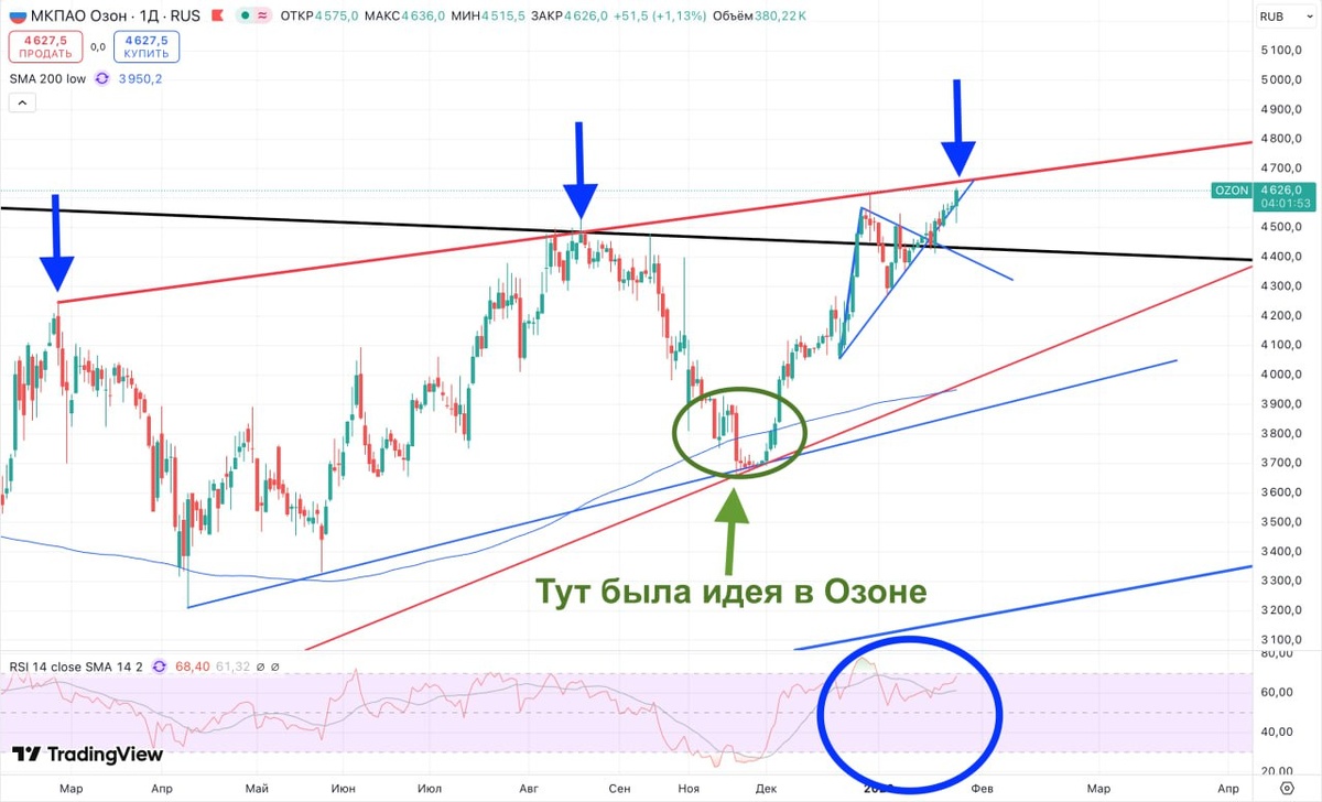 Малейшие просадки тут же выкупаются 💪 Но цена приближается к линии сопротивления, которой почти 11 месяцев (красная линия). Вполне вероятно, что от неё мы увидим фиксацию спекулятивных позиций 🤔 При этом на большем горизонте инвестиционно вижу высокий потенциал в бумаге. А потому даже добрала сегодня чуток на обеденном откате 🧘♂️ Озон входит в команду супер-героев. Идея была на уровнях ниже 3950 рублей 🦸♂️