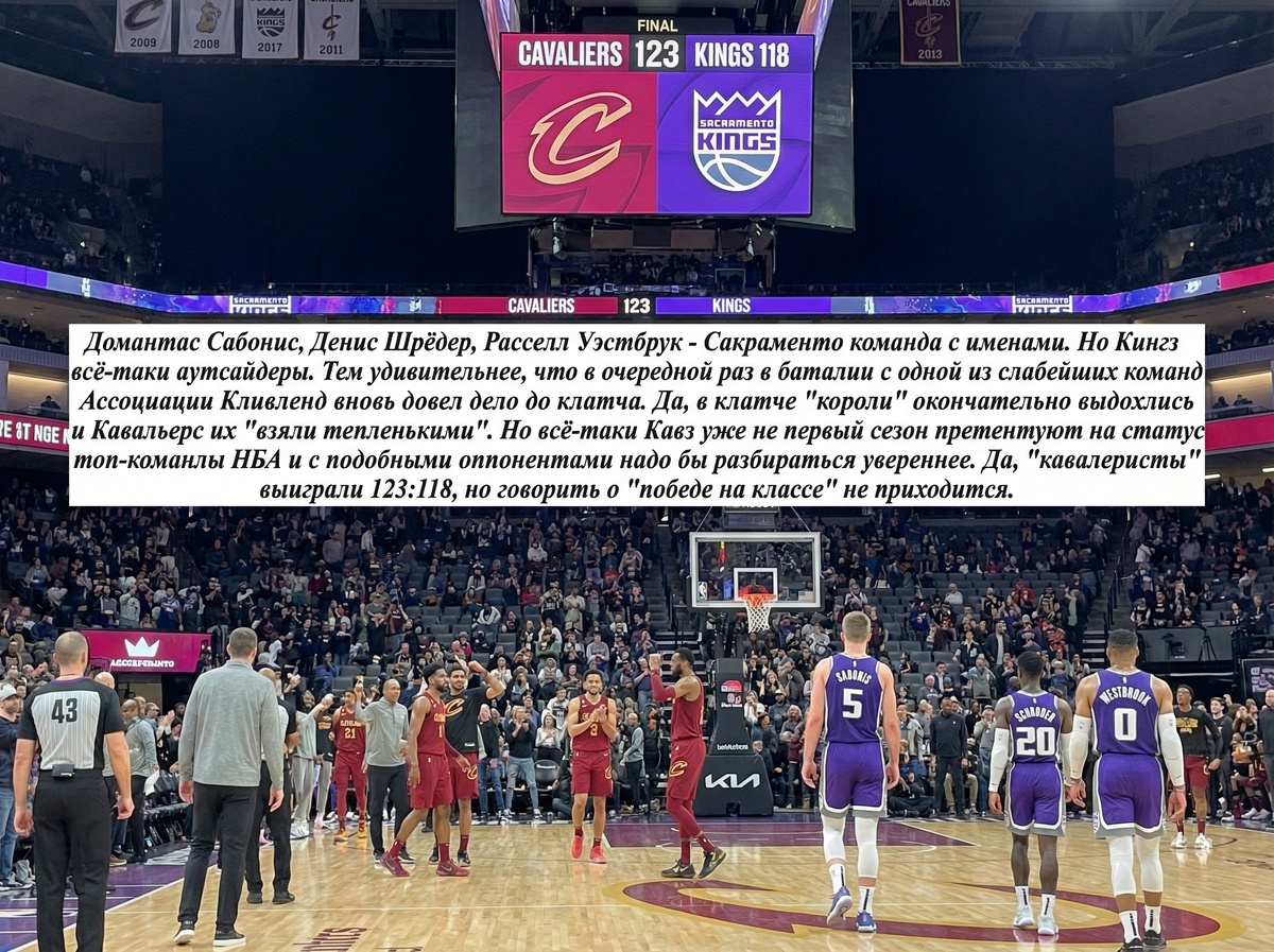 Но Кингз всё-таки аутсайдеры. Тем удивительнее, что в очередной раз в баталии с одной из слабейших команд Ассоциации Кливленд вновь довел дело до клатча. Да, в решающей пятиминутке "короли" окончательно выдохлись и Кавальерс их "взяли тепленькими". Но всё-таки Кавз уже не первый сезон претентуют на статус топ-команды НБА и с подобными оппонентами надо бы разбираться увереннее. Да, "кавалеристы" выиграли 123:118, но говорить о "победе на классе" не приходиться.