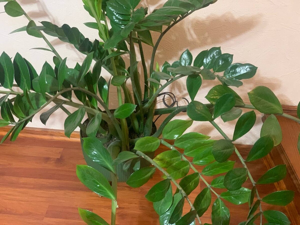 Если ваш замиокулькас стал «распадаться» в стороны, купите специальные зелёные опоры — они почти незаметны, но отлично держат форму куста. Растение будет выглядеть естественно.
