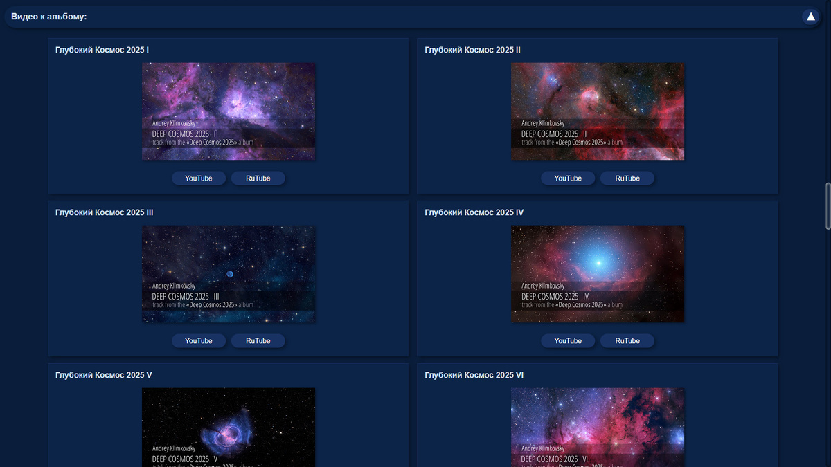 Друзья, все те визуализации, которые фигурировали в недавних постах и имели отношение к альбому «Глубокий Космос 2025», теперь собраны в одном месте — на странице альбома — на сайте NEANE Records. Все их можно смотреть (и слушать) на одной понятной странице. Мне пришлось переработать видео-раздел этой страницы. И наверное следом придется сделать это в отношении страниц других альбомов, для которых тоже есть видео-версии (хотя бы нескольких треков). Раньше видео встраивалось просто видеоплеером с Youtube. Но теперь нужно что-то еще. Я решил использовать две платформы — YouTube и RuTube. Теоретически можно и больше, но практического смысла в этом нет — двух вполне достаточно. Потестируйте то, что получилось. Насколько по вашему мнению это удобно? Всё ли работает? Может быть что-то изменить/улучшить?
