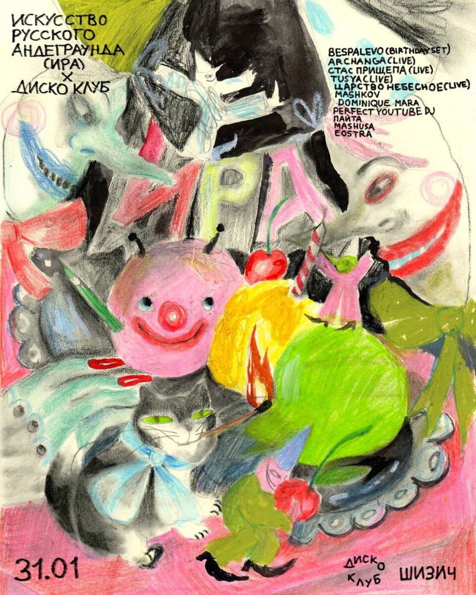 31 января Ира Беспалова приглашает всех на свой день рождения: 31 января с Диско Клубом собираемся в Шизиче, чтобы наконец понять — что такое этот русский андеграунд? Разобраться в этом нам помогут выступления моих любимых артистов и коллег. Приходите отрываться, валять дурака, грустить или радоваться — как вашей душе угодно! С любовью, ИРА 🎫 Билеты Всем Ирам вход свободный 📆 31 января 📍Шизич, Москва, Самокатная ул. 4с1