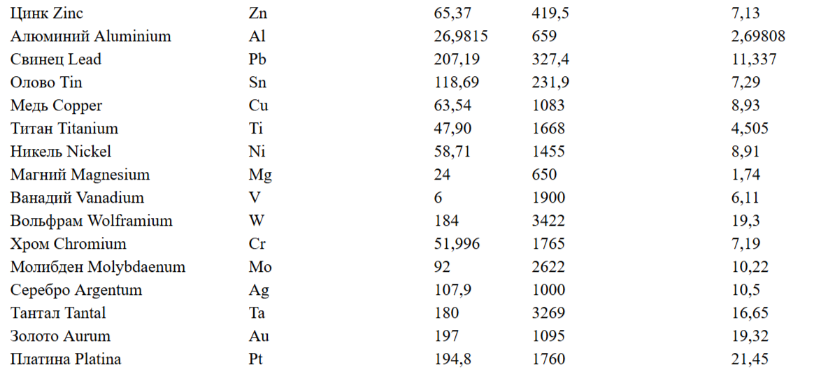 Для сравнения приведем таблицу удельного веса некоторых распространенных металлов:
