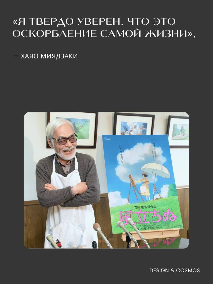», — Хаяо Миядзаки Цитата Миядзаки об ИИ как об «оскорблении жизни» снова на слуху у пользователей интернета. Но контекст, в котором она родилась, говорит о современном искусственном интеллекте куда больше, чем нынешние споры. 👉 История произошла еще в 2016 году. В документальном фильме японскому режиссёру показали демонстрацию новых технологий. ИИ-модель анимировала гуманоидную фигуру, которая «неестественно тащила себя по полу, используя голову для передвижения». Разработчики представили это как эксперимент в «креативных настройках ужасов». 🖊 Увидев это, Миядзаки сказал: — «Я совершенно возмущён». — «Это совершенно отвратительно». — «Я твердо уверен, что это оскорбление самой жизни». — «Я никогда не хочу использовать эту технологию в нашей работе». Свою реакцию он объяснил личной историей: «У меня есть друг-инвалид, который с трудом может пожать мне руку. Когда я думаю о нём, я не могу найти такие изображения настоящими. Только человек может передать боль человека». Его воз