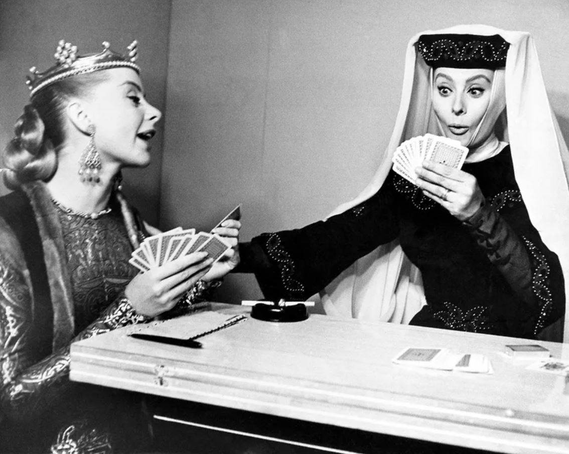 Великолепная фотография, прекрасная актриса, один из лучших исторических фильмов, которые только сняли за все время существования кинематографа. Настоящий рыцарь без страна и упрека Эль Сид, его верная жена Химена, коварная принцесса Уракка, Реконкиста и споры испанских королей и мавров – как же это было красиво снято! А в перерывах между съемками актрисы развлекались картишками. Не очень понятно, в какой игре конкретно Софи Лорен пытается обвести вокруг пальца Женевьеву Паж, но кадр получился прекрасный! На все сто! Вот что значит великая актриса :) В первый раз мне довелось посмотреть «Эль Сида» примерно году в 1990, когда на нашем местном телевидении по субботам весь день отдали под «Субботний телеканал» с ведущим Валерием Майоровым. В советские времена некоторое время молодого Майорова можно было увидеть в передаче «Служу Советскому Союзу», но потом он оказался в Рязани, где так и остался работать на телеканале «Ока». Мне даже как-то раз довелось оказаться с ним за одним столом на