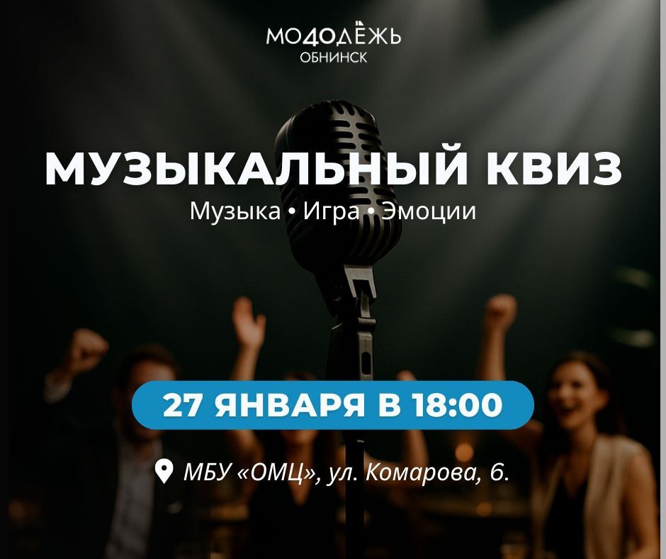! Любишь музыку и считаешь себя знатоком хитов? Приходи проверить свои знания, посоревноваться с друзьями и провести вечер в отличной атмосфере! 🕓 Дата и время: 27 января в 18:00 📍 Место: МБУ «ОМЦ», ул. Комарова, 6, 2 этаж (центральный вход) Предварительная регистрация: clck.ru/3RU8fo 👍 Подписаться | Ваша реклама