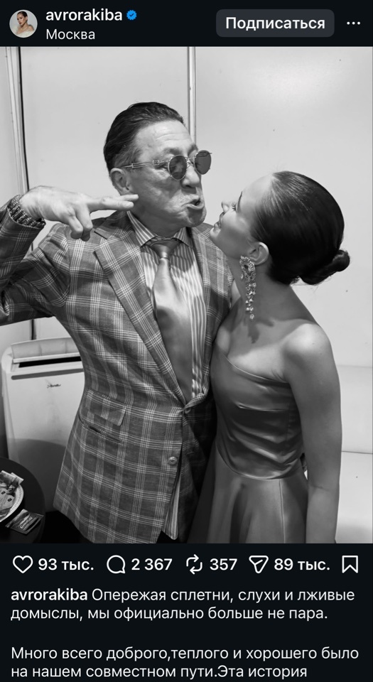 Григорий Лепс и Аврора Киба официально расстались. 63-летний певец Григорий Лепс и 19-летняя модель Аврора Киба официально объявили о расставании. Девушка сама подтвердила эту информацию, выложив в соцсетях черно-белое фото с бывшим возлюбленным и написав пространное сообщение для поклонников и СМИ. Аврора Киба сделала всё, чтобы пресечь слухи и домыслы: она опередила журналистов и заявила прямо — «мы официально больше не пара». По её словам, решение было совместным, взвешенным и принятым без конфликтов. В отношениях, по признанию модели, было много «доброго, тёплого и хорошего», а завершились они на ноте взаимной благодарности и уважения. «Никакой драмы. Мы всегда будем друг для друга близкими людьми, но теперь каждый готов идти своим путём дальше», — написала она в своём Telegram-канале. Интересно, что ещё в декабре 2025 года пара встречала Новый год вместе, демонстрируя единство и опровергая первые слухи о кризисе. Однако уже 25 января 2026 года стало ясно: история любви подошла к к