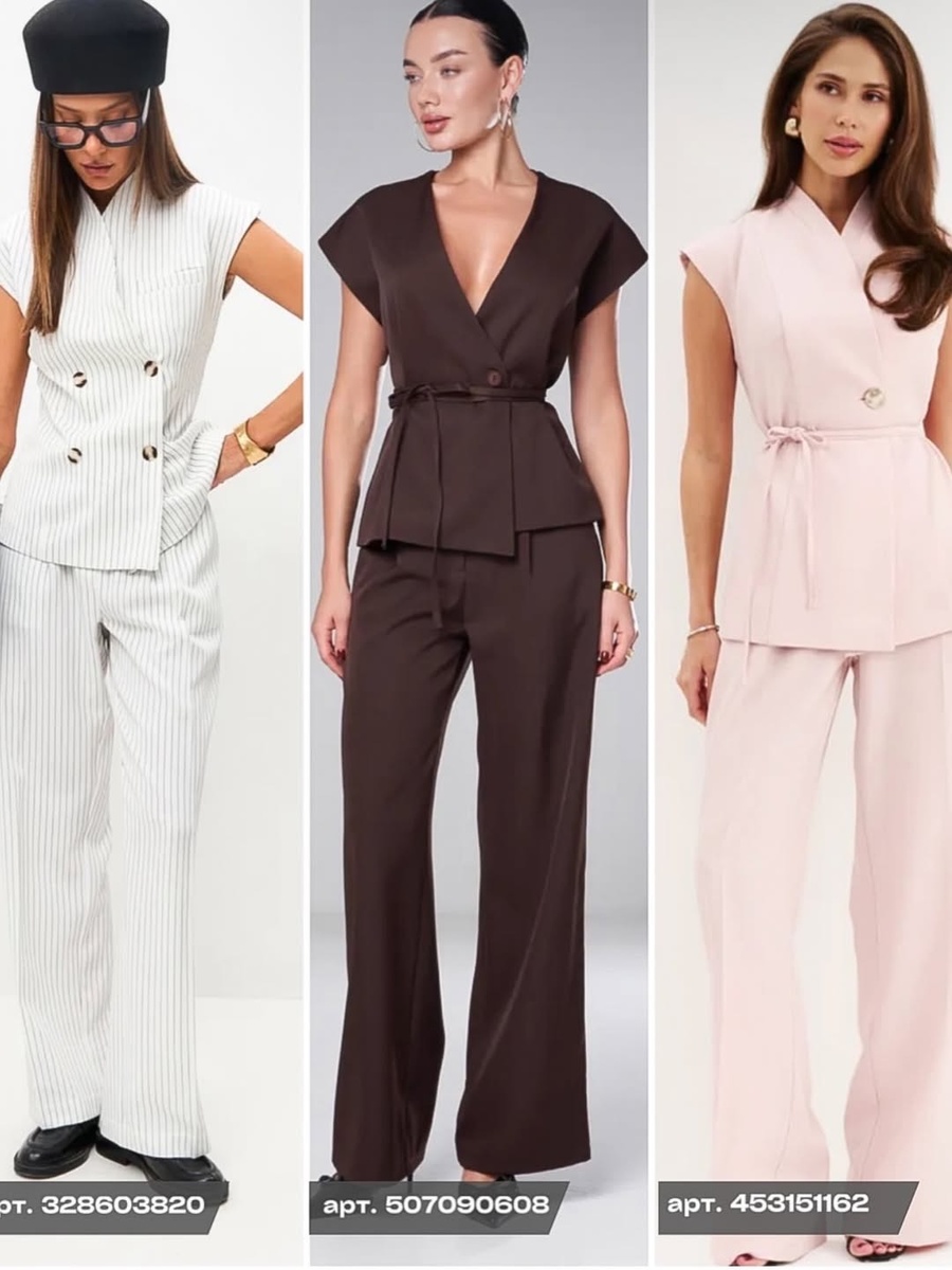 Есть вещи, которые сразу собирают образ «взросло», уверенно и очень чисто по стилю. Это костюмные комплекты и платья с правильными линиями: они держат силуэт, дисциплинируют пропорции и дают тот самый эффект «я просто надела и уже готова». На фото — как раз такие находки: спокойная палитра, акцент на посадку, ремни, двубортные линии, жилеты, плиссе и лаконичные комплекты, которые легко миксовать между собой и с базой.