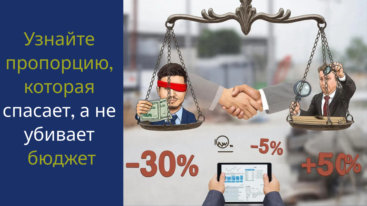 Вы либо доверяете подрядчику как себе, либо контролируете каждый гвоздь. Оба подхода гарантированно убьют ваш бюджет, просто разными способами. Давайте найдём ту роковую пропорцию, которая превращает строительство в финансовую чёрную дыру. Что происходит: Вы нашли проверенного подрядчика, подписали договор и перестали появляться на объекте. Финансовый результат через 3 месяца: Что происходит: Вы ежедневно на объекте, проверяете каждый шов, считаете кирпичи, требуете отчёты каждый час. Финансовый результат: Почему она убивает быстрее всего: Но не такого контроля, который вы представляете. 20% доверия — это: 80% контроля — это: Шаг 1: Доверьте стратегию, контролируйте тактику