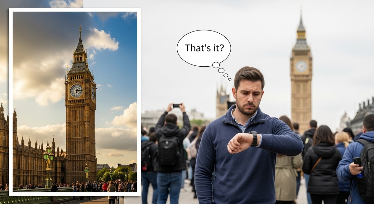 Приехала в Лондон. Биг-Бен в списке обязательных. Икона Великобритании. Символ на всех открытках. Представляла: подойду, увижу величественную башню, почувствую дух Лондона, проведу там час минимум. Выхожу из метро Westminster. Вижу башню. Большая. Красивая. Часы. Фото сделала. Смотрю дальше. Стою пять минут. И думаю: всё? Это всё? Башня с часами. Красиво, но что ещё? Подойти близко нельзя. Внутрь не попасть. Просто смотришь издалека на часовую башню. Сфотографировала. Всё. Пошла дальше. Потратила на Биг-Бен ровно 5 минут. Рядом Вестминстерское аббатство интереснее. Парламент красивее. Биг-Бен — переоценённая часовая башня.