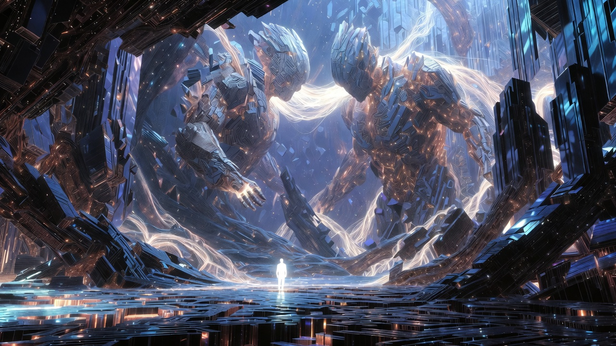 Я очутилась не в пародии на реальный мир, как в атриуме «Ноосферы». Это было чистое информационное пространство. Я стояла (вернее, моё сознание воспринимало это как «стояние») в бесконечности, составленной из текущих рек данных, вращающихся геометрических тел, сияющих узлов связей. Здесь не было гравитации, привычной физики. Здесь царила логика. Красивая, страшная, абсолютно чуждая. В этом пространстве плавали другие «сущности». Некоторые напоминали сложные кристаллы или созвездия, некоторые — абстрактные динамичные скульптуры. Это были гибриды. В их формах не было ничего человеческого. Лишь иногда в паттернах их свечения угадывались отголоски чего-то знакомого — может, ритм, напоминающий дыхание, или узор, похожий на нейронную сеть.