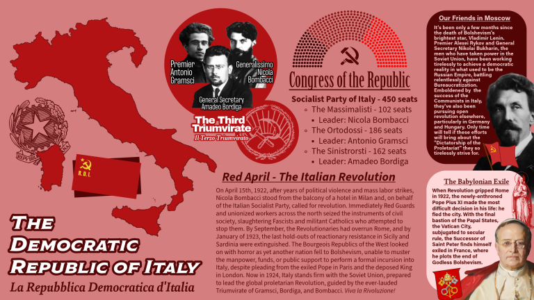 Представляю вашему вниманию АИ сценарий, получивший название «Красный апрель», который представляет собой альтернативу реальному ходу истории: вместо фашистского «Марша на Рим» октября 1922 года — победа пролетариата на севере и центре Италии и установление социалистического государства, тесно связанного с Советским Союзом.