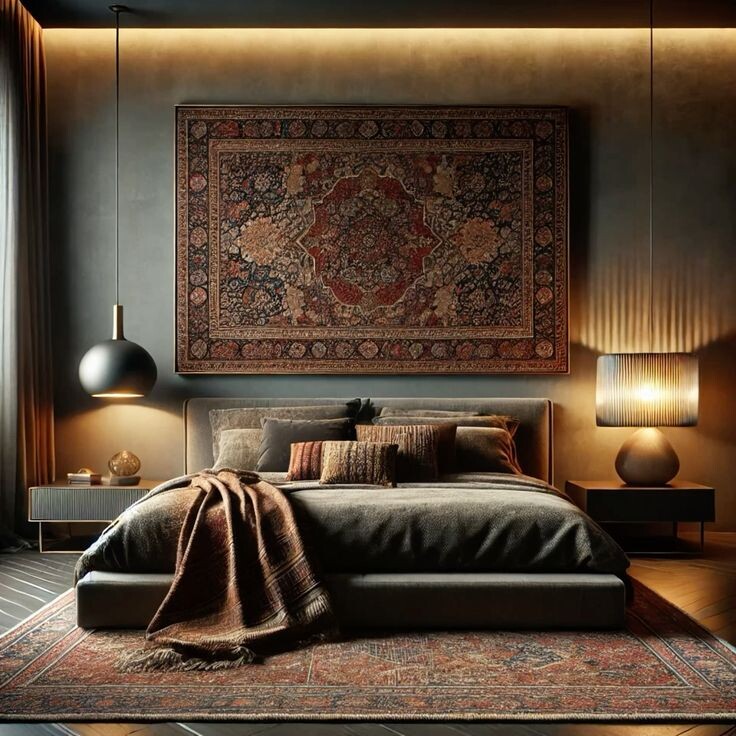 Тренд, который заставит нас по-новому взглянуть на историю. Ковры возвращаются на стены, но в абсолютно новом прочтении. Это уже не просто предмет быта, а мягкое искусство. Сегодня это концептуальные гобелены с абстрактными сюжетами, сложной фактурой и рваными краями. Такой прием не только добавляет уют и улучшает акустику, но и делает интерьер «многослойным», связывая современность с традициями.