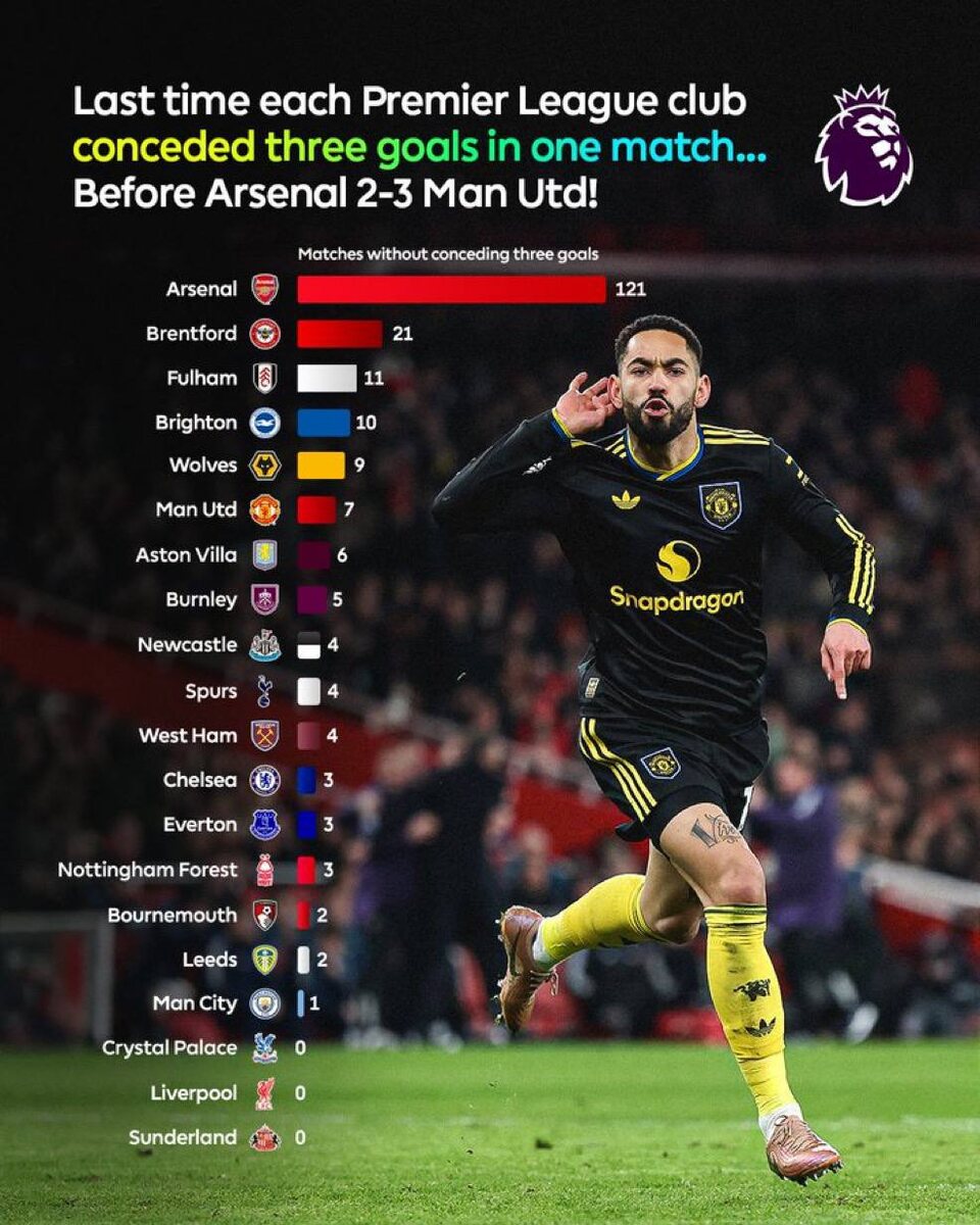 📌 | «Арсенал» не пропускал три гола в одном матче ни в одном турнире 121 игру до вчерашнего поражения от «Манчестер Юнайтед» со счетом 3:2!