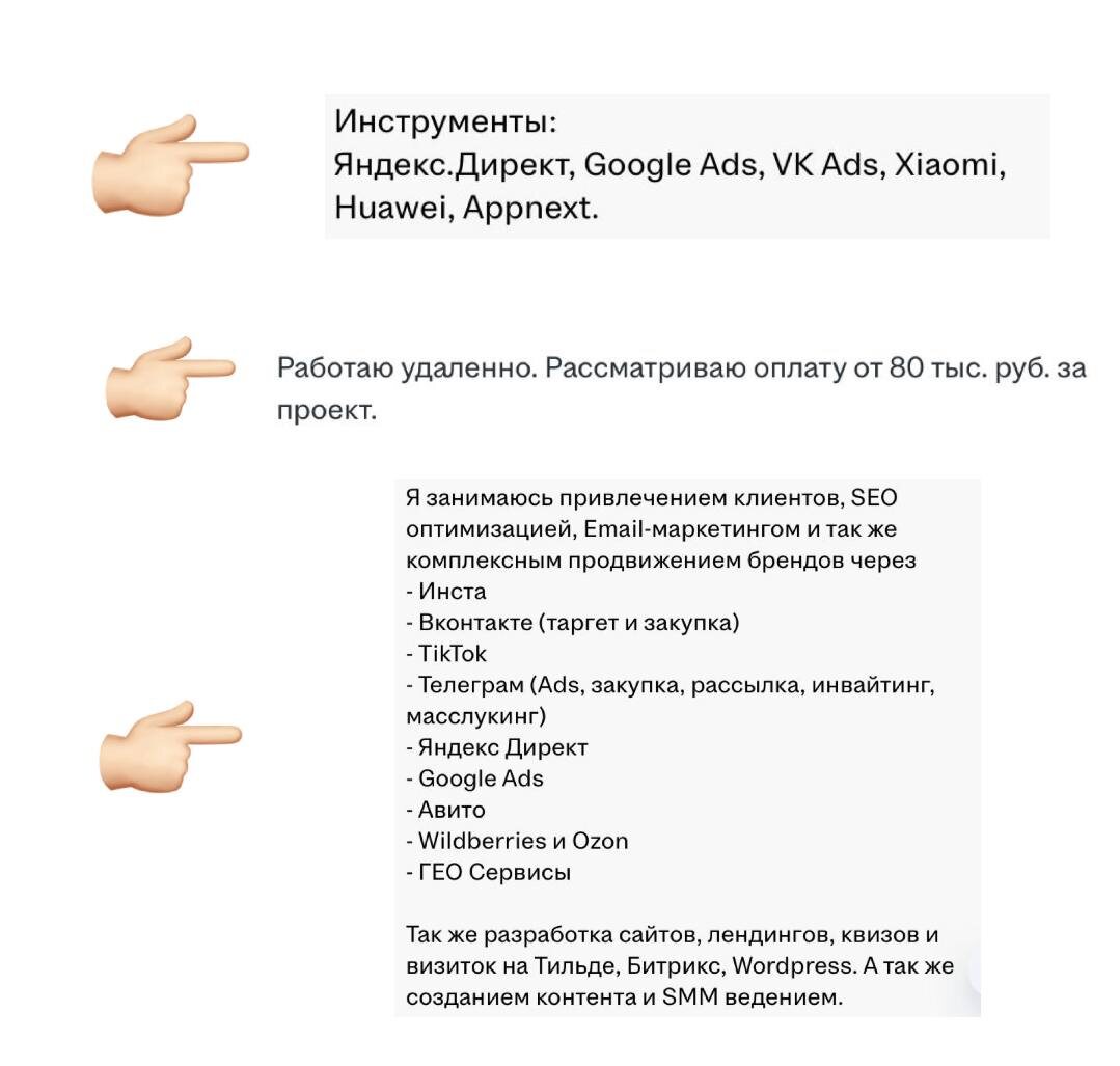 Серьёзно!!! 🫠 Каждый второй — «директолог», «таргетолог», «специалист по росту»… А на деле — 10% реально знают, что делают, а остальные просто очень громко говорят)))) И вот что интересно, всё чаще слышу от клиентов: «Артур, я согласен на ваш чек. Я уже устал искать того, кто сделает рекламу по-настоящему. Просто хочу, чтобы работало🙏» И я их понимаю. Потому что найти профи — всё равно что найти иголку в стоге сена.. 😁 Сейчас мы как раз ищем специалиста по Директу в команду. И читаем отклики… Ох, читаем 😅 Вот вам реальный пример из HH.ru (смотрите скриншоты): 👉 «Готов брать 1 проект — запуск, ведение, оптимизация. Цена — 80 000 ₽. При условии, что это не проект с 10 кабинетами». Друзья… Если у вас один проект, без десятков кампаний, без сложной аналитики, без сквозки — и вы просите 80к… Вы либо живёте в параллельной вселенной, либо считаете, что «оптимизация» — это поменять заголовок в объявлении раз в неделю. А ещё бывает так: — «Я делаю всё: SMM, монтаж, рилсы, таргет, автолов,