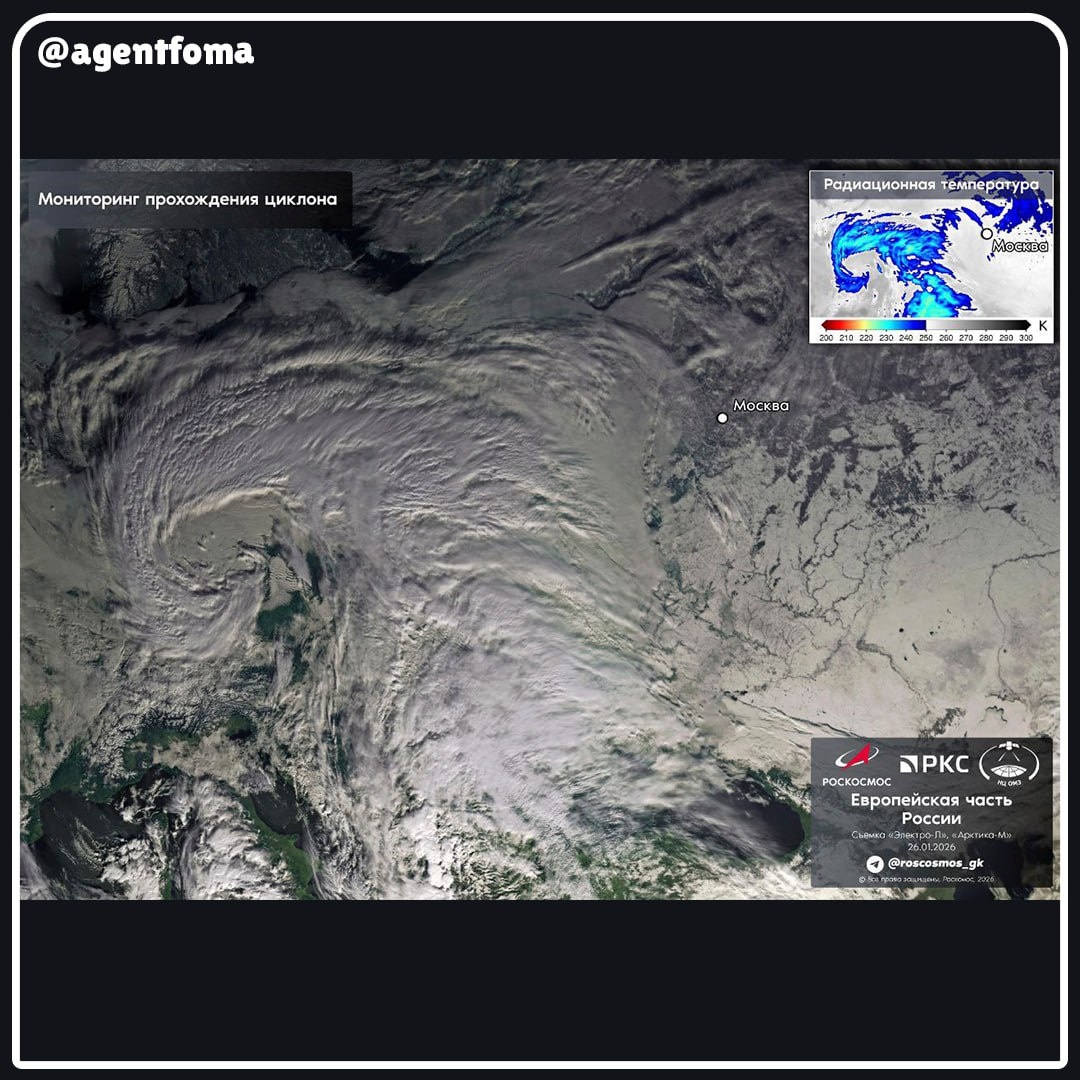 ! Спутники Роскосмоса «Электро‑Л» и «Арктика‑М» запечатлели заснеженную Москву - столицу накрыл мощный снежный циклон. Циклон подошёл к Москве 26 января. Гидрометцентр РФ объявил оранжевый уровень погодной опасности - это значит, что погодные условия потенциально опасны (например, из‑за сильного снега, метели или гололёда). Режим действует до 29 января - следите за обновлениями прогнозов. 📷 Роскосмос Автовладельцы, готовим лопаты на утро... 🥲 👀 @agentfoma собирает новости от других агентов по всему миру... Подписывайтесь, чтобы не потерять!