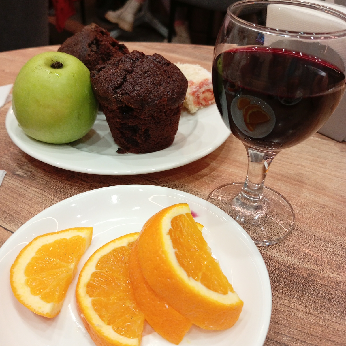 За стойкой любезная девушка нас оформила. Проводила за столик. Кресла очень удобные. Решили выпить кофе из кофемашины. Кофе пили со сливками. Потом нам девушка предложила по фужеру вина, белое и красное. Мы выбрали красное.
