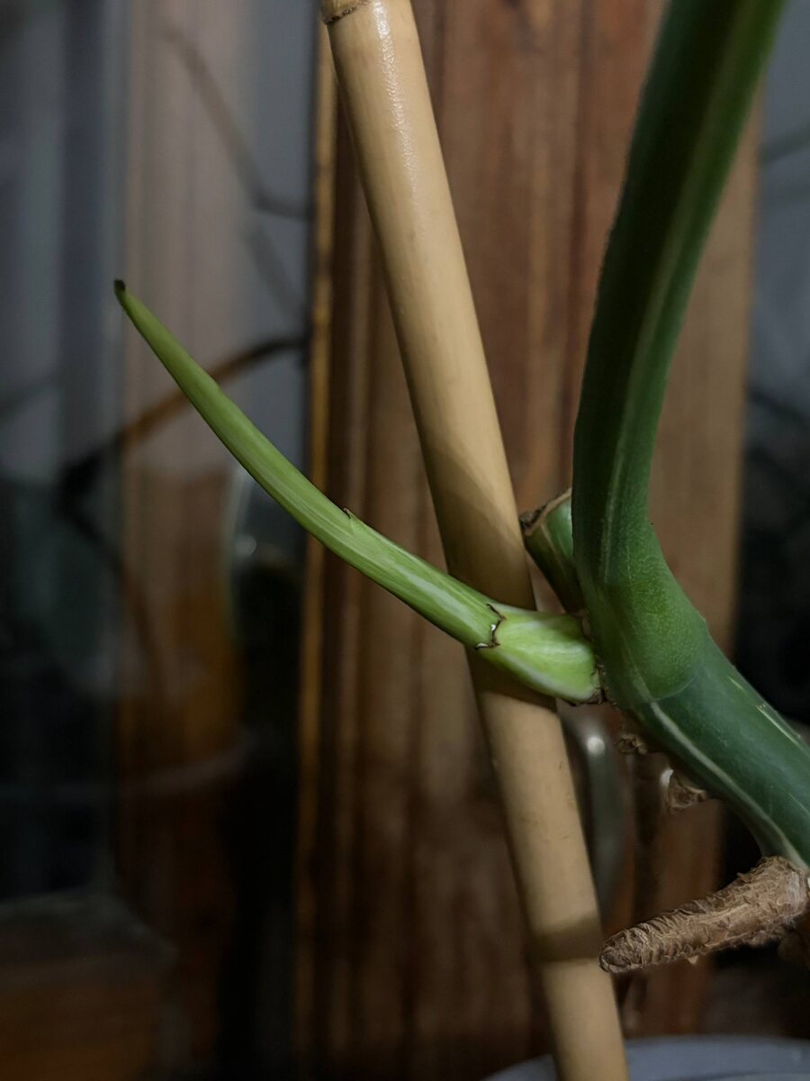 🙃 Моя косячная монстера Альба все-таки выбрала быть альбой, и выдала полосатую почку 💪 Радоваться, конечно, пока преждевременно Но после 4 обрезки, должно же что-то получиться, правда? 🥹👉🏻👈🏻 Будем ждать и надеяться, что все-таки листы будут с хоть каким-то варом (в прошлый раз она ушла в 100% зелень)