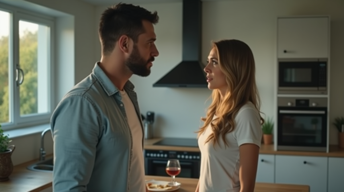 Сергей стоял посреди гостиной, широко расставив ноги, будто уже охранял завоёванную территорию. Руки скрещены на груди. Взгляд тяжёлый, уверенный, почти торжествующий.