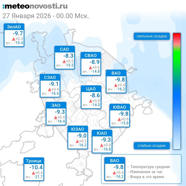 В 0:00 в Москве было от -10.4°C до -7.9°C, средняя температура -9.2°C #погода #Москва #зима #температура #27января #вторник