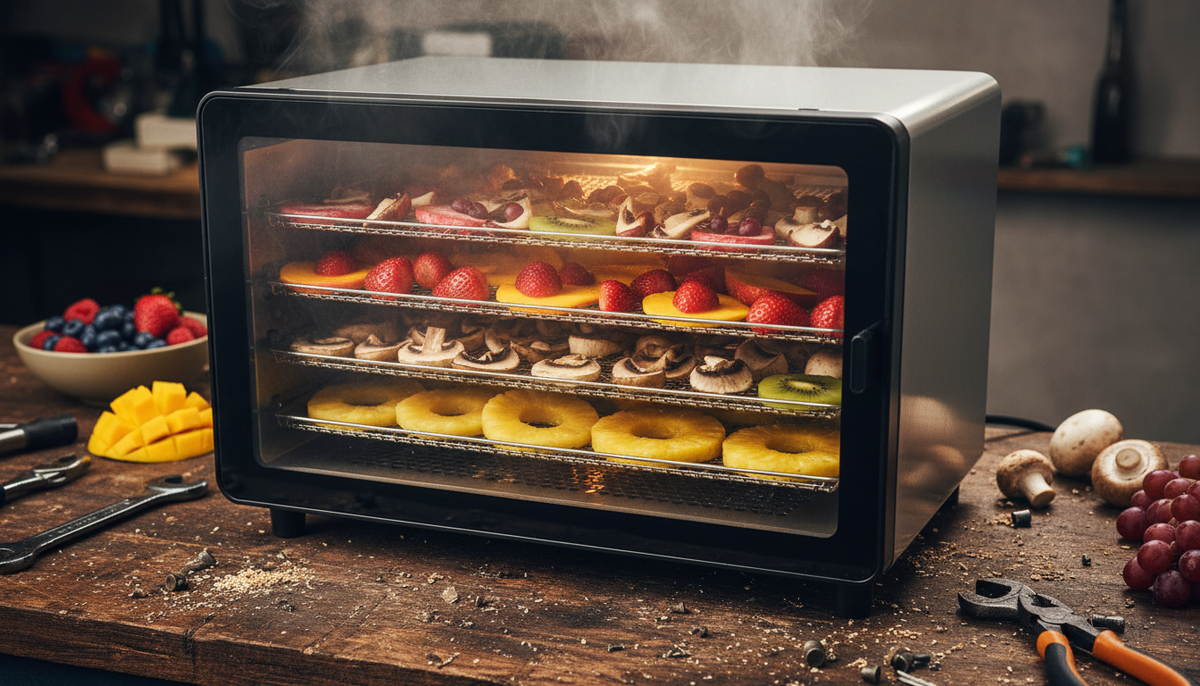 Тестировал лично, без гугла и фейков. День 1: нарезал груши с дачи тонко, как чипсы Lay's, на 55°C на 8 часов. Выход — 1 кг сухофруктов из 3 кг свежих, сладкие, как конфеты, без единой плесени. Минус? Сок капает, если не поддон с лотками — но в комплекте есть поддон для сбора, не утонет кухня. День 2: грибы белые из леса (собрал сам, протёр). На 45°C 12 часов — аромат, как в тайге, хрустят идеально. Поехал на стройку, жрал с кофе — энергия на весь день, без тяжести в желудке. День 3: травы для чая (мята, мелисса из сада). 35°C на 6 часов — цвет сохранился, вкус бомба. Даже бананы сушил — чёрный юмор: один поддон сломал ножом при чистке (мой косяк), но пластик не треснул. Мясо? Говядину вяленую на 65°C 10 часов — жёсткое, солёное, как в армии, но своё, без нитритов. В общем, протестировано в реале: гараж, лес, кухня — везде тащит.