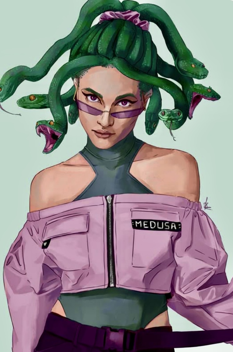 В далёком будущем, когда границы между реальностью и виртуальностью стёрлись, появился загадочный страж — Медуза. Она не была обычной героиней: её змеиные волосы — это не просто часть внешности, а живые кибернетические сущности, способные взламывать любые цифровые замки и защищать от вирусов. На её куртке гордо красуется надпись «MEDUSA» — символ силы и непокорности.