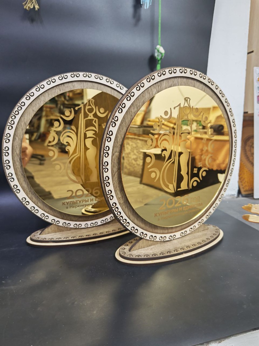 Изготовили на заказ в честь года культуры и единства такие две стеллы из золотого акрила и дерева. Диаметр 30 см👍