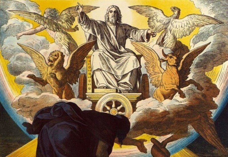 "И когда они шли, я слышал шум крыльев их, как бы шум многих вод, как бы глас Всемогущего, сильный шум, как бы шум в воинском стане; а когда они останавливались — опускали крылья свои. И голос был со свода, который над головами их; когда они останавливались, тогда опускали крылья свои" (Иез. 1:24, 25). В стихах 24 и 25 мы находим два упоминания о голосе. Один звук был "как бы глас Всемогущего", а другой —"глас" с престола Господа. Это богоявление, вероятно, было ошеломляющим и вселяющим страх событием. В нескольких местах Писания могучий глас Божий сравнивается с сотрясающим землю грохотом. В Исх. 20, когда Бог провозгласил Десять заповедей, мы читаем, что "народ видел громы и пламя, и звук трубный, и гору дымящуюся; и увидев то... отступил и стал вдали" (ст. 18). Когда Бог спрашивал Иова из бури, Он задал ему вопрос: "Такая ли у тебя мышца, как у Бога? И можешь ли возгреметь голосом, как Он?" (Иов 40:9). Пс. 28 представляет собой, пожалуй, одно из самых доскональных описаний в Библии