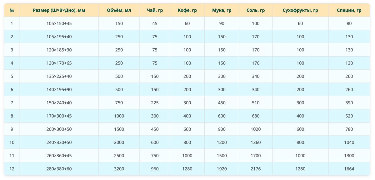 Сколько поместится в doy-pack чая, кофе, жидкости, сухофруктов?